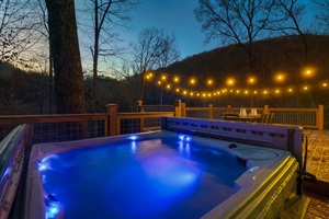 -Outside: Huge deck with outdoor table, hot tub, and bistro lighting.