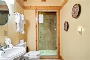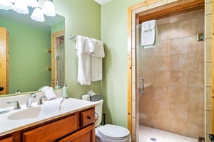 -Shared bathroom between green rooms with walk-in shower