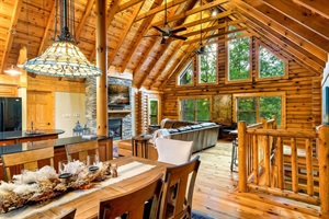 -Great Room: Massive leather sectional overlooking a 70" TV and a wall of windows. Separate dining area, bar seating, and reading/ coffee nook.