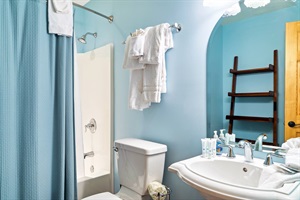 -Shared bathroom between blue rooms with tub/shower combo.